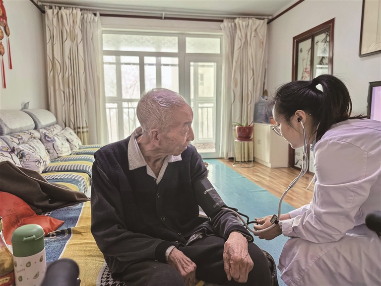 近日,昌吉州党委老干部局通过“公益+购买”方式,为州直离休干部开展家庭医生、家庭保洁、上门理发等个性化服务,让他们度过一个温馨祥和的新春佳节。图为昌吉州中医医院医护人员为离休老干部测量血压。□赵丽娟摄
