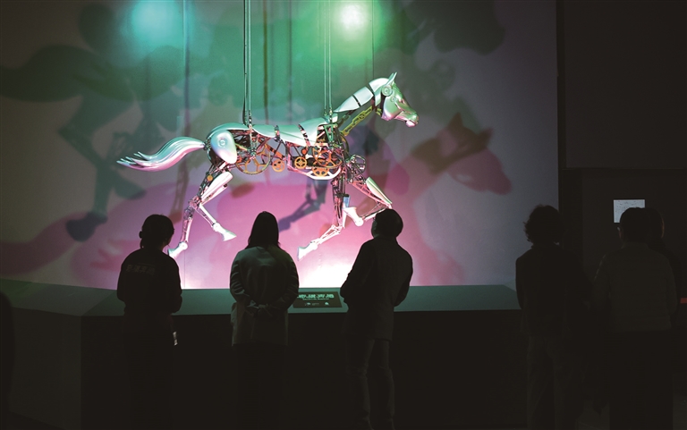 右图:2月10日,参观者在一个机械马展品前驻足观看。