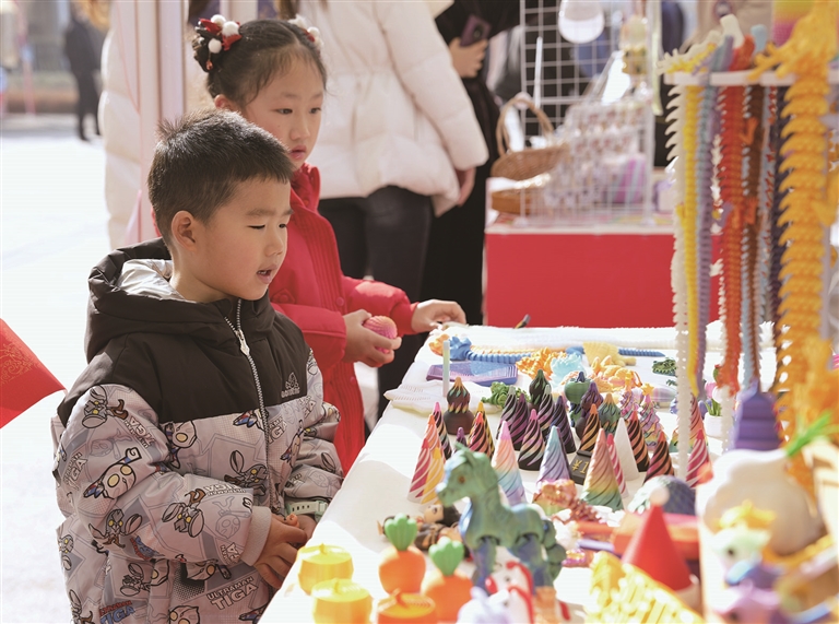 上图:2月11日,小朋友在村糖会现场选购3D打印玩具。