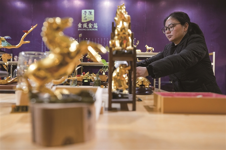 在南京金陵金箔集团股份有限公司,工作人员在展销中心整理生肖马年金箔产品(2月9日摄)。