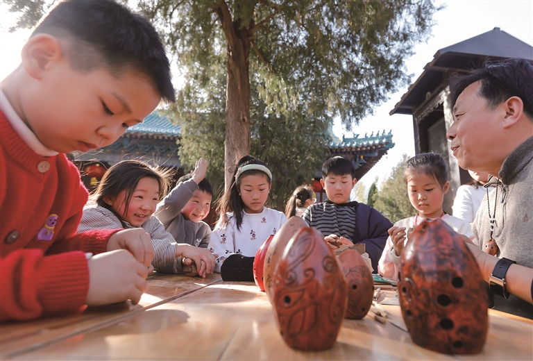 2月20日,在河南省武陟县嘉应观黄河文化博物馆,小朋友学习用黄河泥制作“黄河泥埙”。