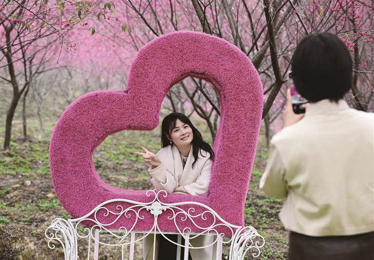 2月18日,游客在福建省罗源县松山镇北山村的樱花园里留影。