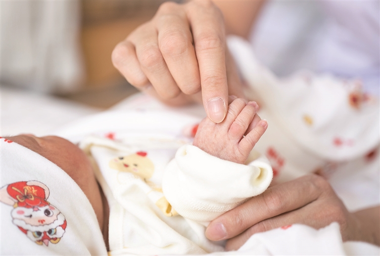 2月17日,昌吉州人民医院产科住院部,护士在给新生儿做抚触按摩。
