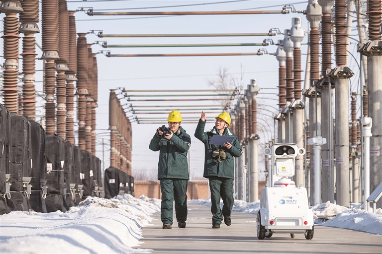 2月17日,国网昌吉供电公司220千伏长宁变电站,变电运维中心值班员和巡检机器人在站内巡检。