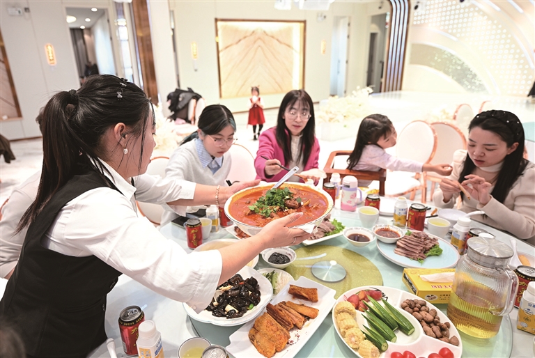 2月18日,人们在宁夏吴忠市盐池县一家餐厅聚餐。服务员端上当地特色美食——鸡肉摊馍。□新华社记者 冯开华摄