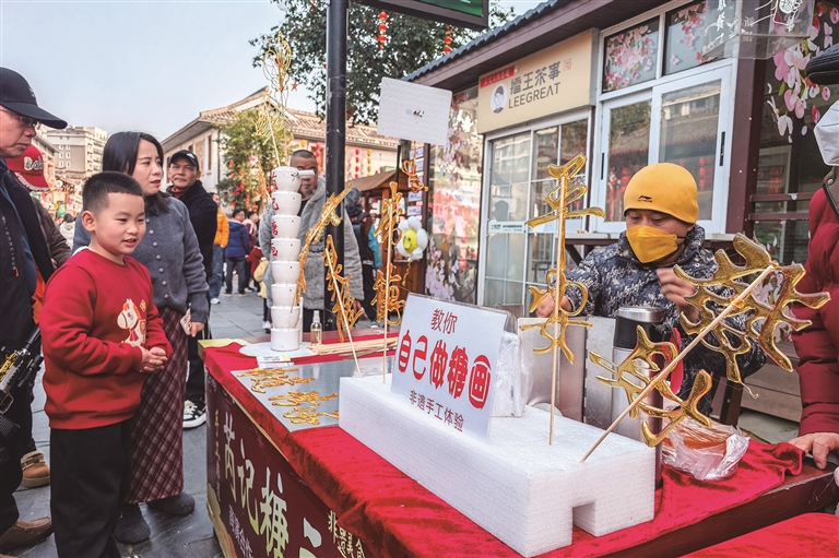 2月17日,游客(左)在湖南常德河街购买糖画。□新华社记者 陈思汗摄
