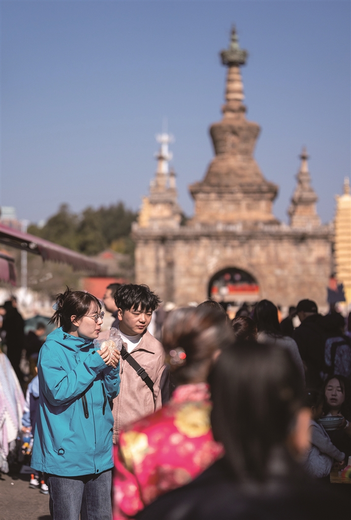 2月18日,游客在昆明市官渡古镇品尝官渡粑粑。□新华社记者 江文耀摄