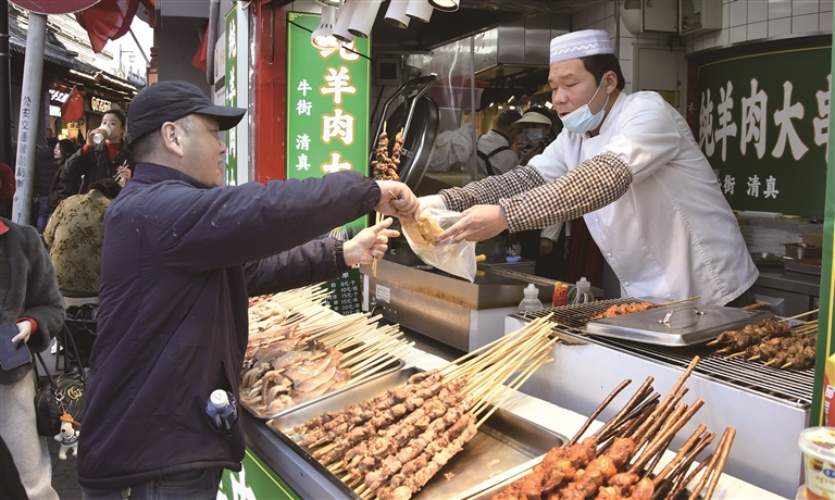 2月18日,游客在北京后海景区品尝美食。□新华社记者 李 欣摄