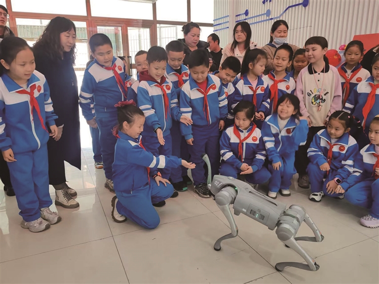 近日,在呼图壁县科技馆,孩子们围观机器狗表演。 □安培茹摄
