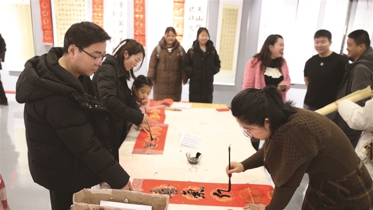 在昌吉市美术馆展厅内,书法名家现场挥毫,楷隶行草各具神韵,大红宣纸上“福”字笔力遒劲、寓意吉祥,市民们领福字将新春祝福带回家。同步开展的新春主题画展集中展出山水、花鸟、人物等百余件佳作,以艺术语言描绘盛世新春,吸引众多艺术爱好者驻足品鉴、拍照打卡。不少家长带着孩子观展体验,在墨香与画意中感受传统美学与节日氛围。