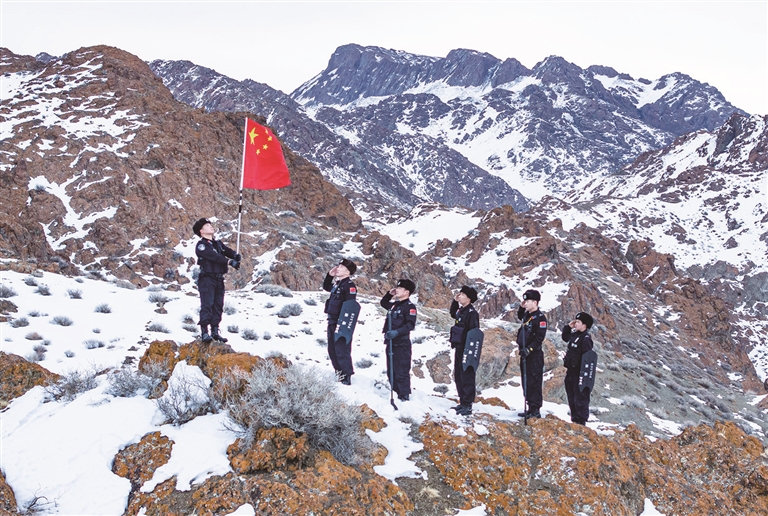 2月20日,昌吉州北塔山边境一线,昌吉边境管理支队库甫边境派出所民警在巡边途中,列队向国旗敬礼。春节期间,驻守在昌吉州北塔山边境一线的昌吉边境管理支队库甫边境派出所,组织民警深入边境山区、林带、峡谷等区域,采取马巡、步巡的方式开展巡边踏查,坚守祖国边境一线,守护辖区平安与团圆。