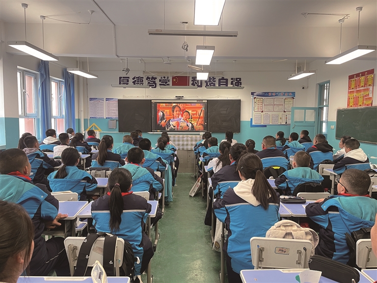 3月1日,吉木萨尔县第二中学七年级(2)班学生收看《书香润昌吉 开学第一课》节目。