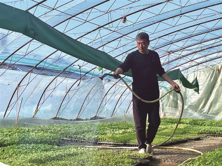 2月25日,阜康市九运街镇六运中心村的蔬菜大棚基地,农户正在给幼苗浇水。
