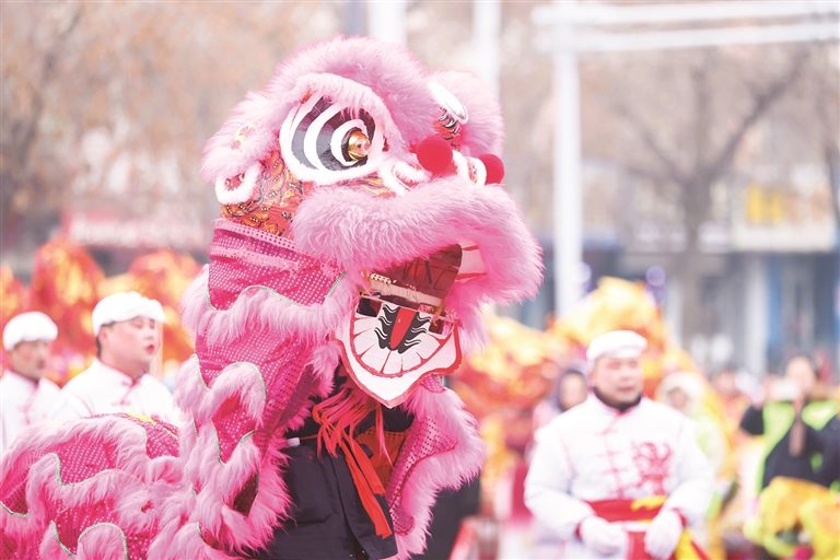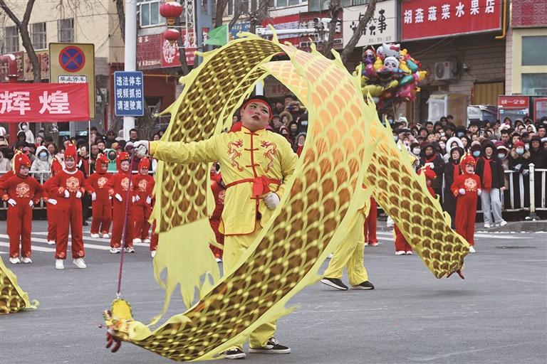 队伍另一侧,返乡大学生张智超正舞动着一条金色长龙。“龙是吉祥的象征,能参与舞龙表演,我觉得特别有意义。”张智超说。