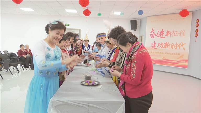 3月2日,昌吉市天方社区开展“我们的节日·元宵节”活动。图为身着节日盛装的各族群众欢聚一堂包汤圆。
