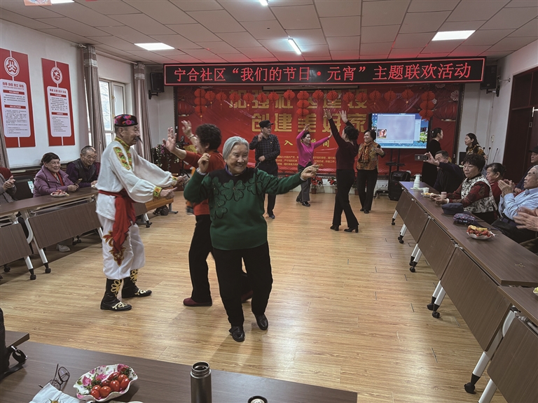 近日,在昌吉市宁合社区,居民们跳起欢乐的舞蹈,共庆元宵佳节。□哈莉娅摄