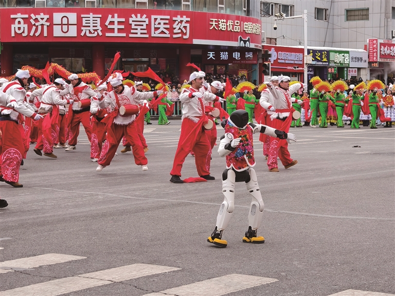 社火一开场,只见一台造型灵动的机器人,踩着铿锵的锣鼓点,有模有样地扭动着身体,加入了秧歌表演的行列。
