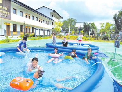 “放假了,我和姐姐几乎每天都来这里,可以在图书馆里写作业、看课外书。现在又有了泳池,我们可以玩水、打水枪,真是太好啦!”正在游泳池中嬉戏的一个孩子兴奋地说。