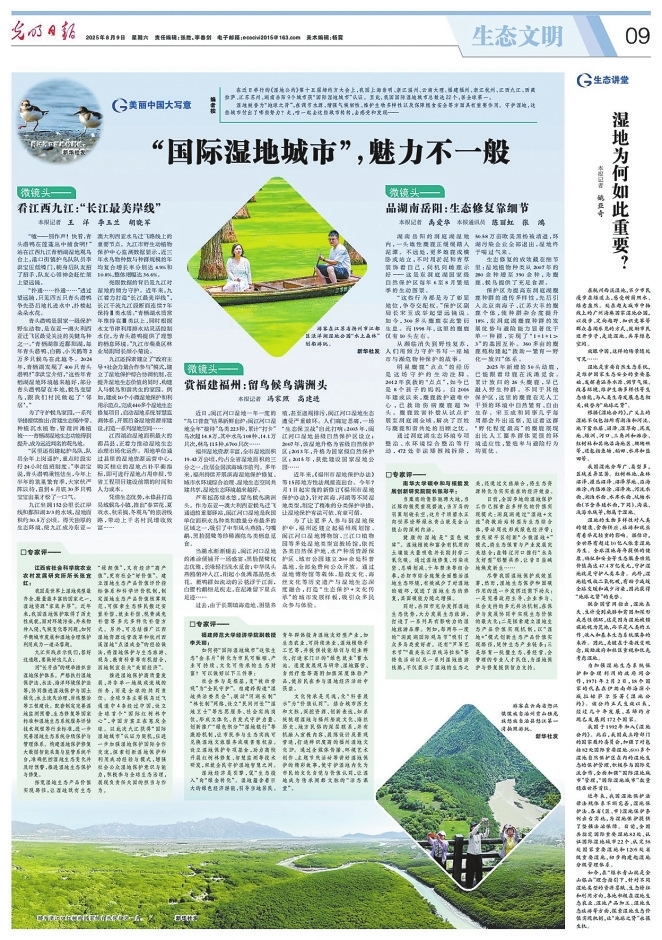 8月9日,《光明日报》9版整版专栏稿件《“国际湿地城市”,魅力不一般》,其中以《看江西九江:“长江最美岸线”》为题,单条报道了九江为了守护候鸟家园,接续推出一系列举措,在提升湿地生态价值的同时,构建人与候鸟和谐共生的家园。