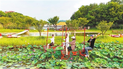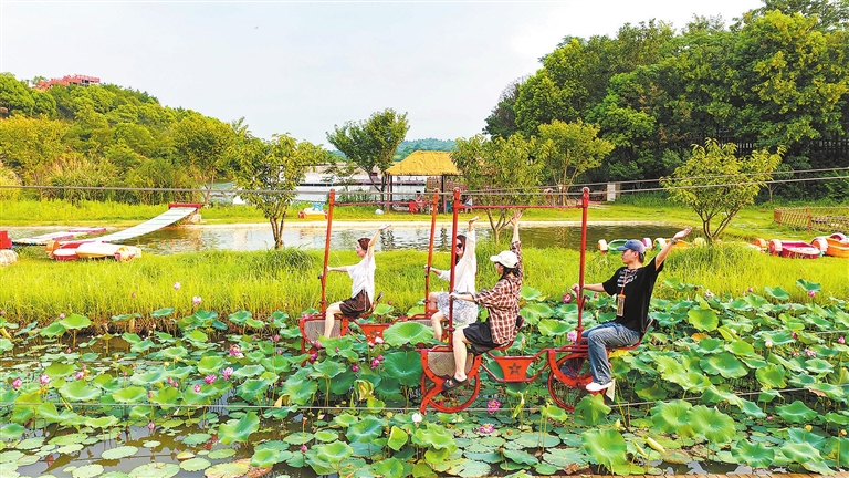 8月2日,庐山市海会镇山水忆恋生态农庄,游客踏着低空自行车在荷花池中穿行。庐山市结合秀美乡村建设,改善乡村人居环境,打造乡村旅游亮点,带动消费业态的全面升级。 (特约记者 韩俊烜 摄)