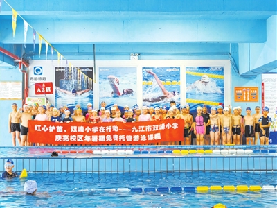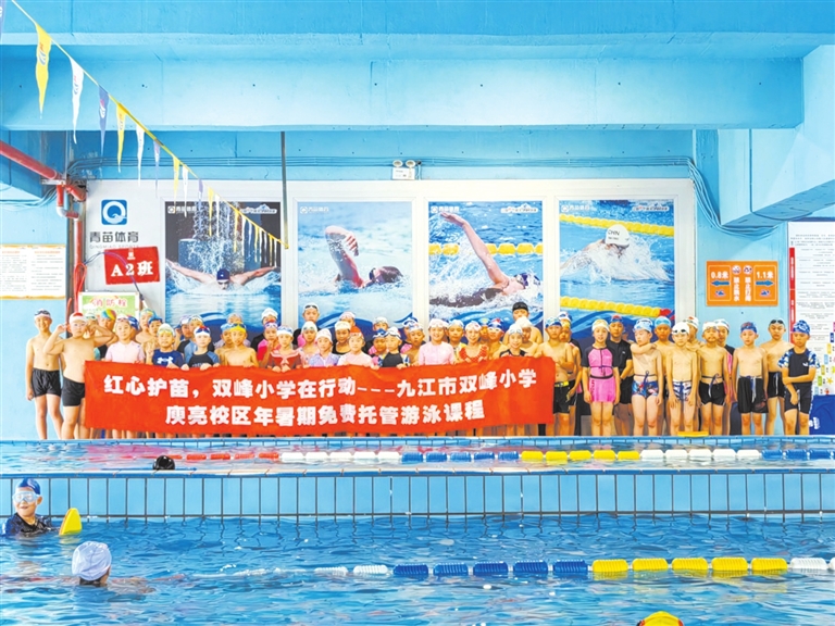 为贯彻落实《九江市中小学生游泳教育试点工作行动计划》,切实提升学生身体素质与防溺水能力,2025年暑期,市双峰小学持续开展“红心护苗”暑期免费游泳培训活动,为学生们搭建安全、专业的游泳技能学习平台。 学校精心设置三期培训课程,每期开设三个可选时段,并严格控制班级人数,确保教学质量。培训课程融入专业游泳技能教学与防溺水安全教育,通过“理论+实践”的方式,让学生掌握自救互救技能。培训结束后将进行达标考核,以考促学,确保实现“学会游泳、学会自救、安全度夏”的目标。(沈 克 摄)