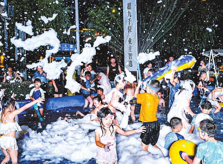 持续高温天气,浔城各类水上娱乐活动受到追捧。在保障安全的前提下,许多家长带着孩子在水池中消暑娱乐。(本报记者 张 驰 摄)