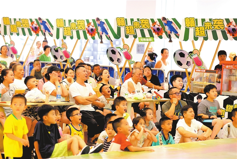 8月10日,赣超第五轮九江队客场挑战上饶队,市民在九龙广场观看赛事直播。场上球员的精彩表现时刻调动着大家的情绪。