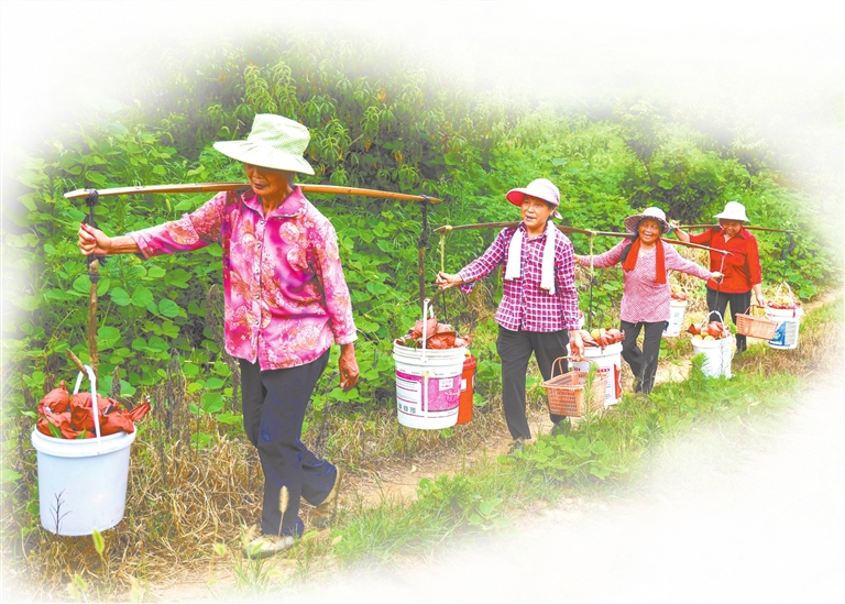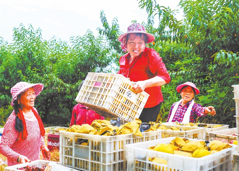 走进果园,村民们正忙着采摘、分拣、装箱,欢声笑语不断。李腾月的果园每个季度都需要大量散工进行除草、施肥、包果、采摘等工序,每月为务工人员发工资两万元左右。