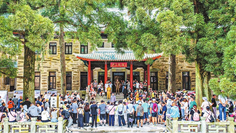 8月3日,庐山风景区,游客们在庐山抗战博物馆观看抗战主题情景剧。今年暑期,游客在庐山休闲避暑的同时,可以通过观看情景剧、展览等形式,追忆庐山人民抗击日本侵略者、捍卫民族尊严的历史。(特约记者 韩俊烜 摄)