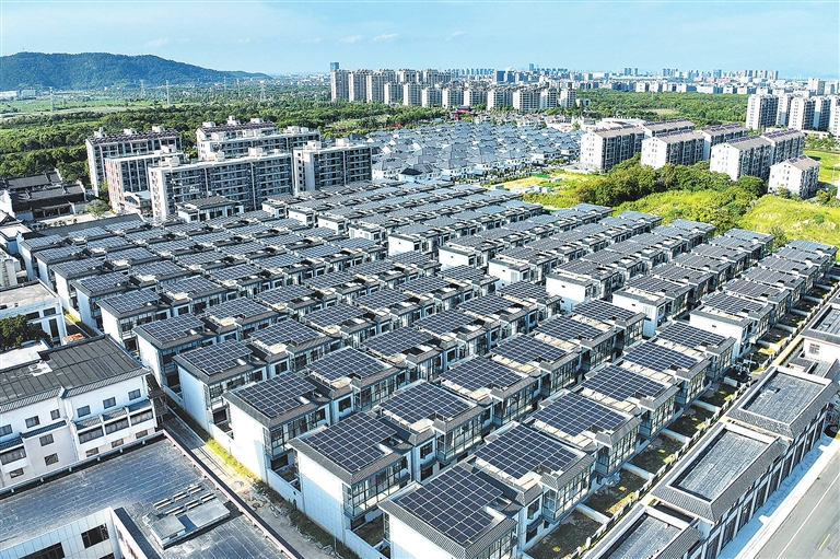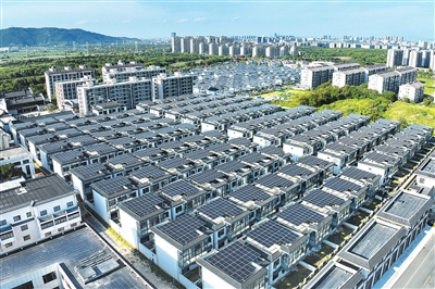 8月12日拍摄的宁波奉化萧王庙街道滕头未来社区屋顶分布式光伏发电项目(无人机照片)。