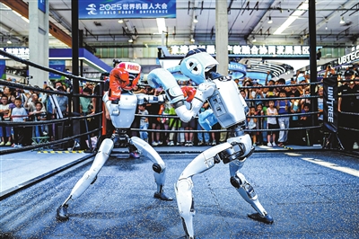 在世界机器人大会展馆内,观众在宇树机器人展台观看机器人拳击展示(8月11日摄)。(新华社记者 鞠焕宗 摄)