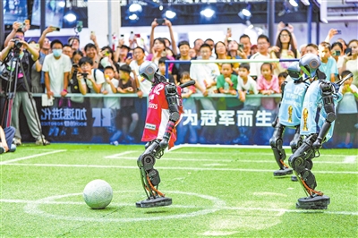 在世界机器人大会展馆内,观众在加速进化公司展台观看人形机器人足球赛演示(8月11日摄)。
