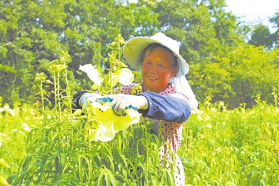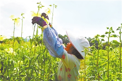 今年,沙港村新引种的200余亩黄蜀葵迎来盛花期,进入采摘旺季。“花开不等人,每天清早4点多就得下地采摘,11点后花的品质就会下降。”村民余喜荣一边麻利地摘花一边说,“我们住在附近,这份活儿对老年人来说比较轻松,还能照顾家里,挺好的。”