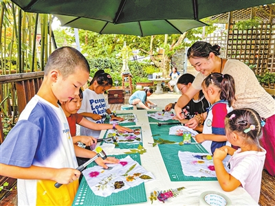 8月13日,在庐山牯岭镇云上归墅民宿院子里,举办了一场植物拓印体验活动,孩子们在老师指导下,将花草拓印在布料上,感受自然与手工艺术融合的乐趣,快乐过暑假。 (本报记者 程 鹏 摄)