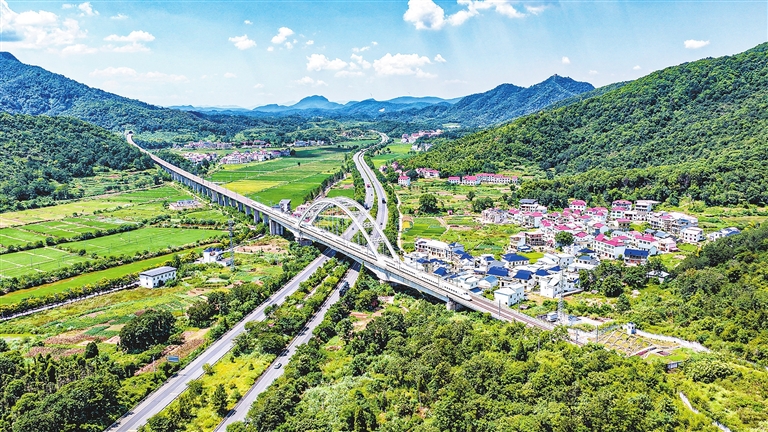 8月17日,高铁列车飞驰在瑞昌市南阳乡境内,与青山、田园、村落等构成一幅秀美的乡村画卷。(魏东升 摄)