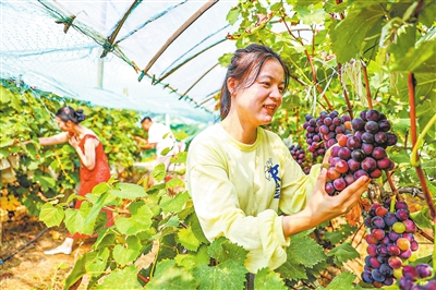 日前,游客在柴桑区涌泉乡黄洞村长岭葡萄种植基地采摘葡萄。柴桑区涌泉乡以国家农村综合性改革试点为契机,通过设施赋能、模式革新和丰富业态,推动120余亩富硒葡萄基地实现大丰收,有效促进富民产业发展。(本报记者 张 驰 摄)