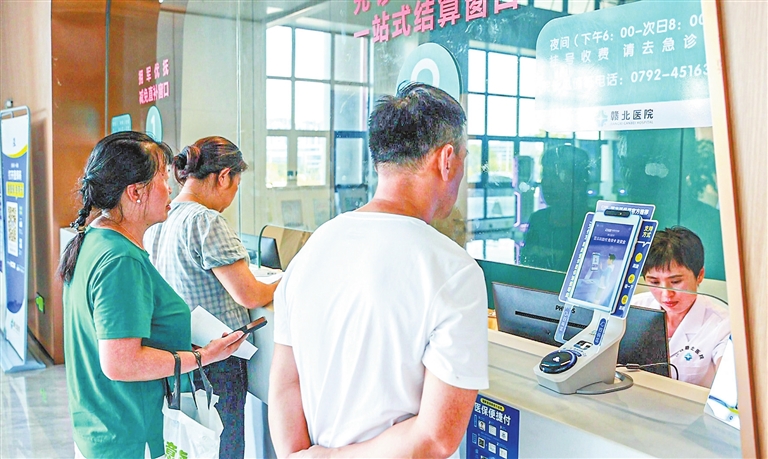 近日,在共青城市多家医院收费窗口,新增的“医保刷脸支付”终端格外引人注目,市民在设备前完成面部识别后,系统即刻提示“支付成功”,相较传统支付方式,效率提升显著。忘带医保卡无法就医、老年人不熟悉手机支付……这些困扰患者的就医难题,如今在共青城市有了新解法。随着共青城市各医院陆续上线“医保刷脸支付”功能,实现从挂号到缴费全流程“刷脸即结”,让群众就医更加便捷。(潘 成 本报记者 刘 家 摄)