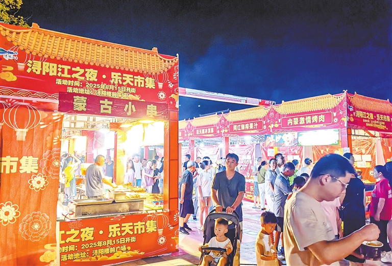 8月15日晚,夜色中的浔阳楼广场人头攒动、热闹无比。当天晚上,2025浔阳江之夜·乐天市集正式开街,大量游客和市民来到浔阳江畔,体验古风国潮、品尝各类美食。极具特色的文旅活动为夜经济注入了新活力,也进一步丰富了游客的出游体验。 (本报记者 欧阳海员 刘 家 摄)
