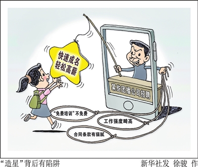近年来,一种被称为“团播”的新型网络直播形式,受到许多网友喜爱。与此同时,“快速成名轻松高薪”等招聘话术,吸引许多年轻人加入团播“逐梦演艺圈”。“高薪”是许多团播公司招聘时的宣传口号,但记者调查发现,所谓的“高薪”背后藏着“免费培训”不免费、合同条款有猫腻、工作强度畸高等许多陷阱。 (新华社发 徐 骏 作)