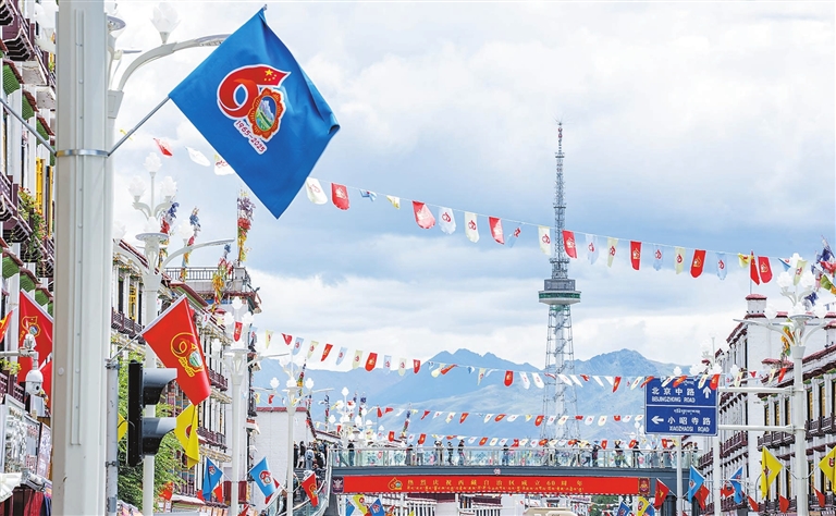 在庆祝西藏自治区成立60周年之际,拉萨街头张灯结彩,处处洋溢着喜庆氛围。