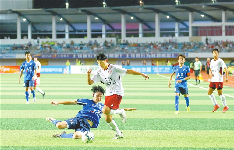 即便夕阳西下,柴桑区体育中心依然如蒸笼般炽热。老中青三代九江球员的身影仍在绿茵场上跃动——汗水砸进草皮,目光如炬,每一个动作都写满坚定。