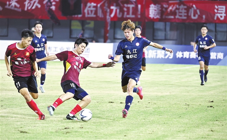 8月23日晚,九江队对南昌队比赛中,场上拼抢激烈。(本报记者 欧阳海员 摄)