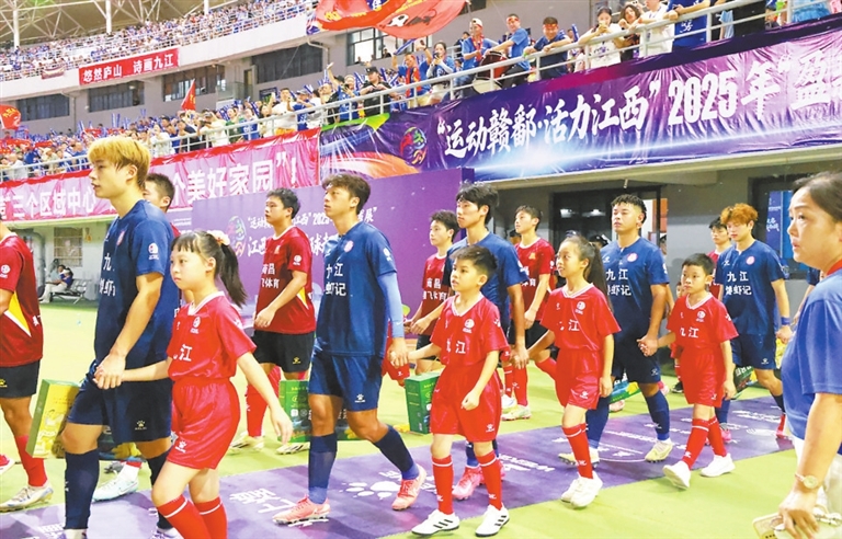 本报讯(记者张新红/文 洪显智/摄)8月23日的夜晚,热烈而璀璨,26名小球童牵手九江与南昌两队球员,一起见证这激情四射的精彩。“九江九江,威震四方!”九江市融媒体中心小记者——李歆怡发出呐喊,足球梦在这一刻深植于心。