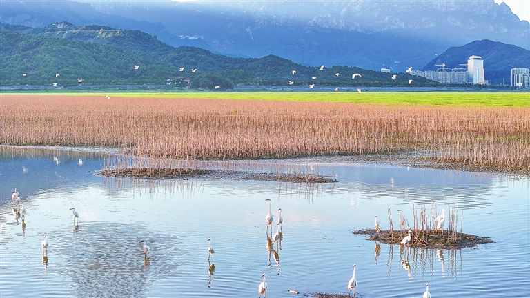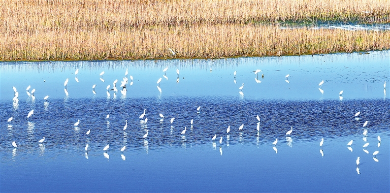 嬉戏的白鹭与岸边的芦苇荡,勾勒出湿地生态的灵动与静谧。
