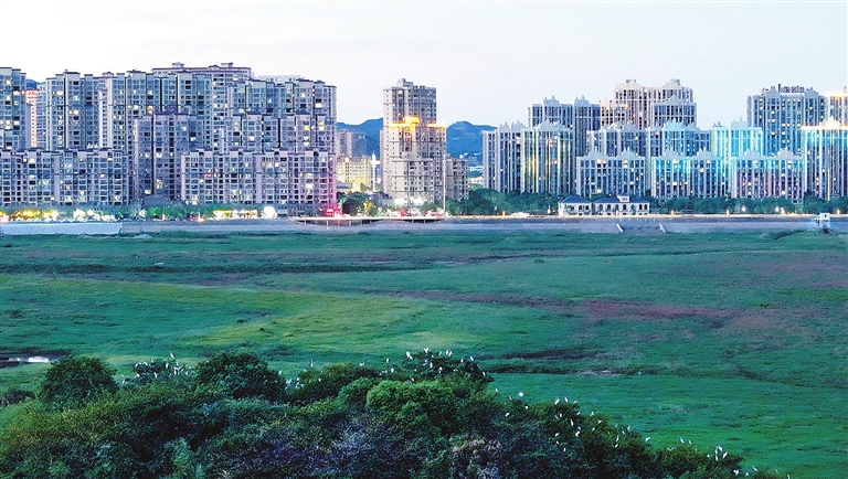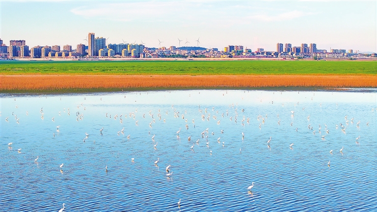 湿地水域中的白鹭,与远处高楼、风车构成自然与城市交融的生态图景。