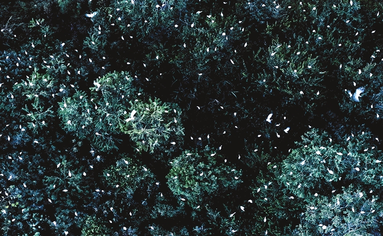 夜晚下的高空俯瞰,白鹭在树冠间飞舞、停歇,宛如洒落的漫天星辰。