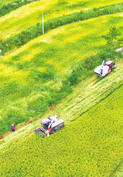 8月23日,在重庆市梁平区礼让镇新华村,农民驾驶收割机收割稻谷(无人机照片)。(新华社发 刘 辉 摄)