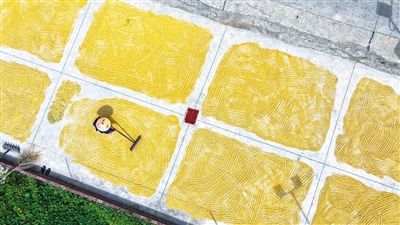 8月24日,在湖南省常宁市洋泉镇,农民在晾晒稻谷(无人机照片)。