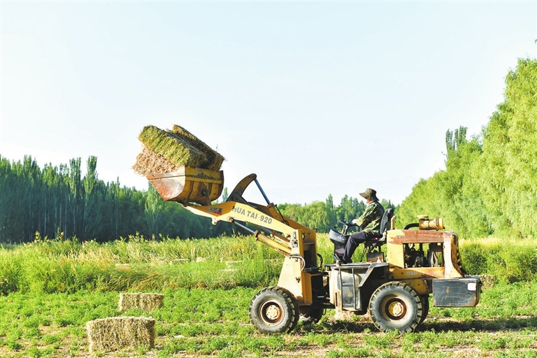 8月24日,在甘肃省阿克塞哈萨克族自治县红柳湾镇红柳湾村,农民在田间回收成捆的苜蓿草。(新华社发 高宏善 摄)