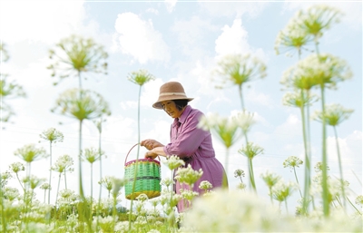 8月23日,在山东省淄博市沂源县悦庄镇朱家庄村,农民在采摘韭菜花。(新华社发 赵东山 摄)